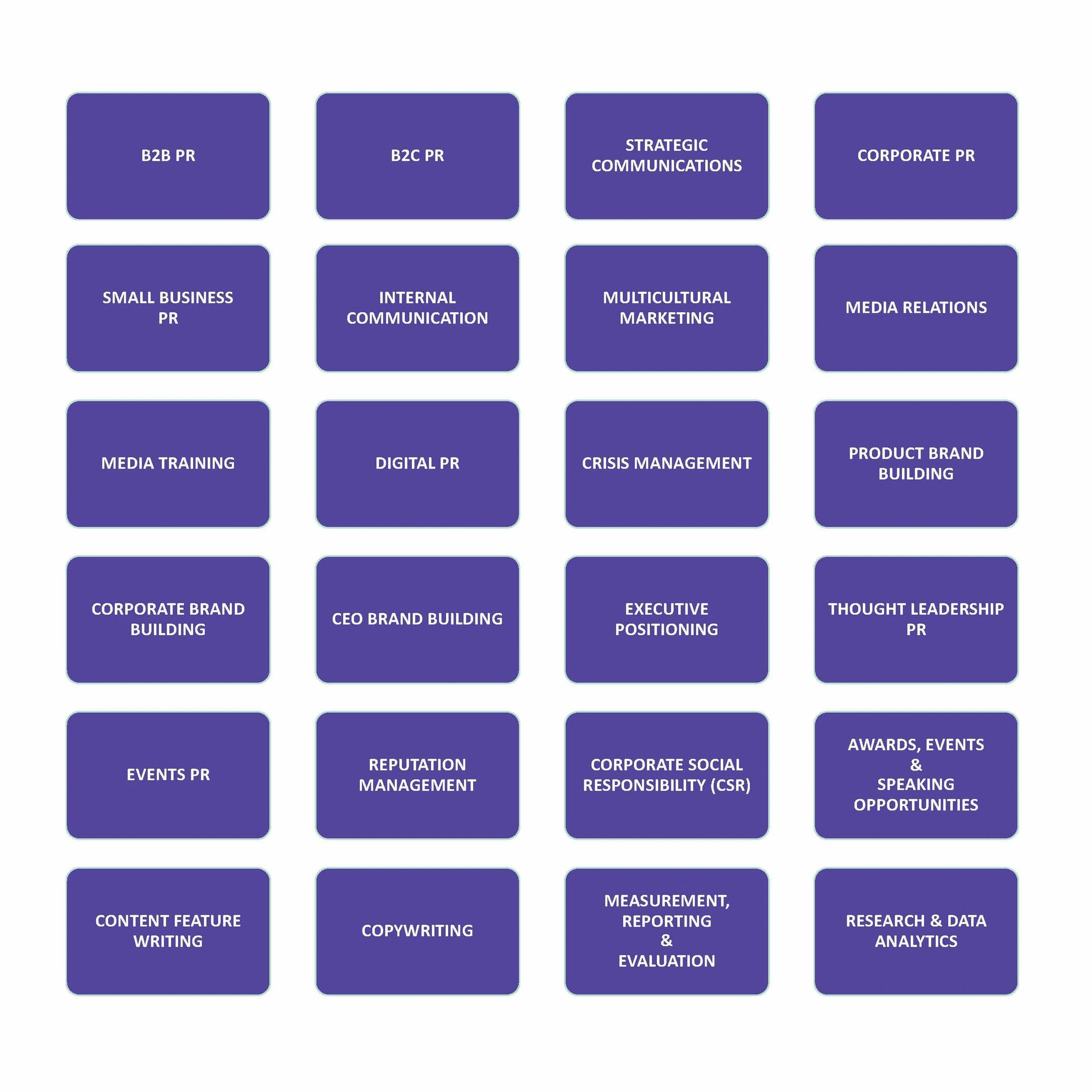 We offer a comprehensive range of integrated marketing and public relations services, including but not limited to traditional public relations, digital marketing, social media, media relations, crisis communications, online reputation management, talent and influencer outreach, media training, content marketing development, thought leadership & event management.